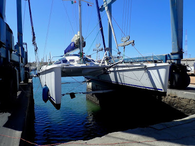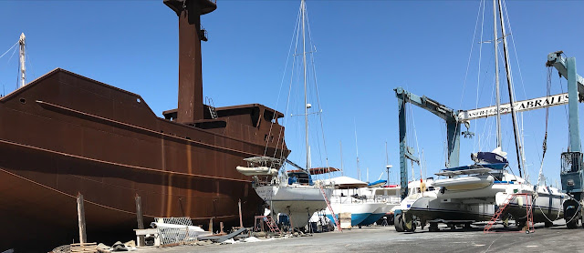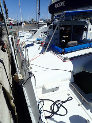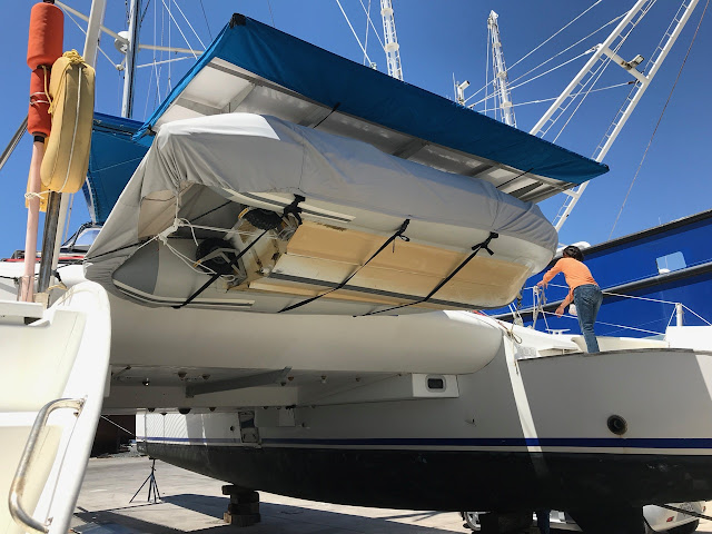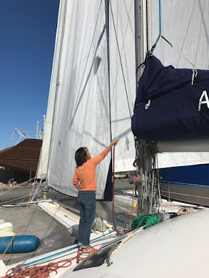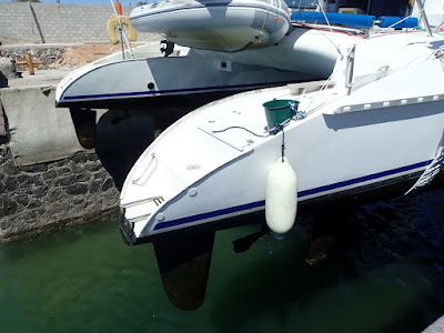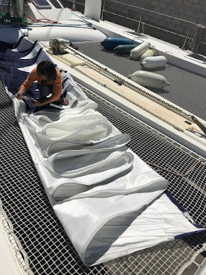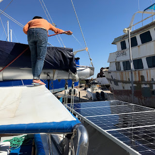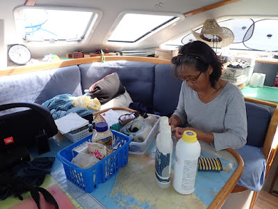 We need usually between one week to 10 days to prepare ALCYONE for long months of dry storage before leaving...this is the condition to find everything in good state on our way back. This year is special, we have only 2 days, but we could worked a lot on board to prepare on the way....The most important is the rinse of the sails, the boat...protect de pannels the dinghy before final cut of 3 batteries banks.