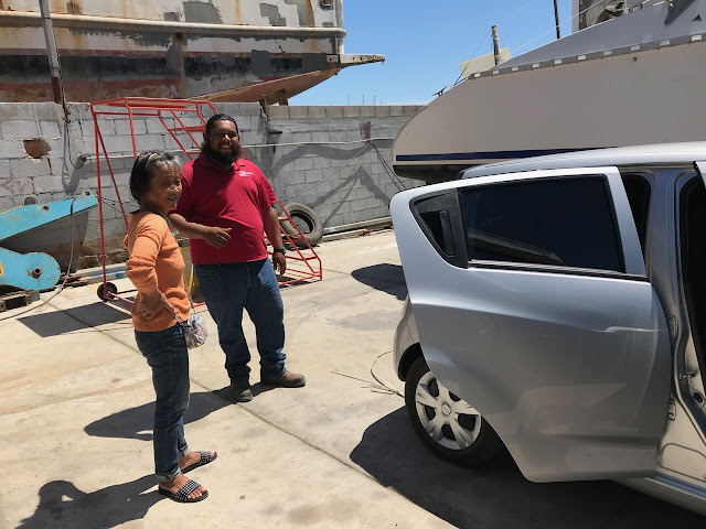 Marcos from the shipyard is ready to bring us there on 4th afternoon; Just before leaving, our nice mexican driver help us to remove the 2 heavy daggerboard (110 kg each) from the cat . Then he filled his tiny Chevrolet Spark with our luggage and we leave in early afternoon all 3 PUERTO PENASCO.