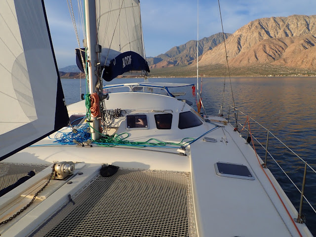 On 27th n 28th march, North wind is too strong: We wait, cleaning interior of cat as far as we can before the coming dry dock; We can leave the anchorage of PUNTA SANTO DOMINGO on 28th evening and start motoring ...2 nights including 6 hours later, on 30th morning, we arrive in BAHIA OF LOS ANGELES. No more cruisers, no more pangas, our light wind sailing approach to the village in the morning is strange; no internet too here... we want to continue northward but an other northern is forecasted and we have to stop : LA GRINGA anchorage is the good place to wait again, to rest, to clean...